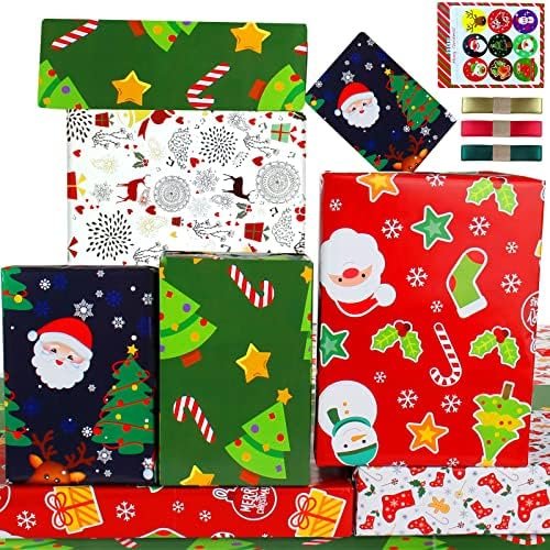 Carta Regalo Natale Bambini e Nastri,Set Carte Regalo Natalizia per Bimbi Bambino,Carta Natalizia per Regali e Rosso Blu Babbo Cervo Disegno,Carta da Regalo Natale,Carta da Pacchi per Incarto Regali